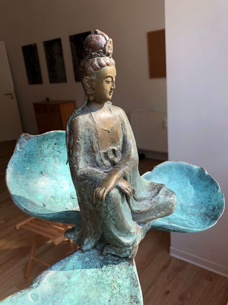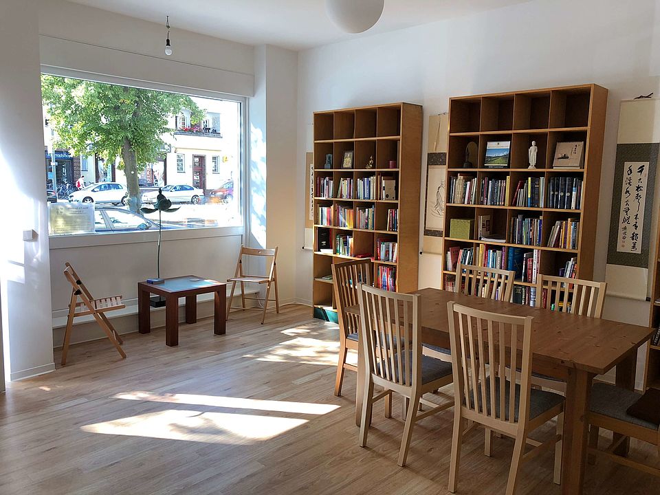 Buddhastatuen und Meditationsmatten hat Shifu von Taiwan nach Berlin verschiffen lassen. Einige Möbel hat sie gebraucht erstanden und dann das kleine Zentrum kurz nach ihrer Ankunft in Berlin eröffnet. Während wir Tee trinken und uns unterhalten, ist der Verkehrslärm als stete Geräuschkulisse sehr präsent, das Zentrum liegt an einer viel befahrenen Durchgangsstraße. Dass die Tür nur angelehnt ist, ist Shifu sehr wichtig. Es lädt die Menschen ein, hereinzukommen, sagt sie, nimmt ihnen die Berührungsängste. Und es kommen täglich Leute, wie sie berichtet, einige einfach nur neugierig, was das für ein Ort ist, andere, weil sie sich für Meditation oder auch Buddhismus interessieren. Ein junger Mann kommt und holt ein Postpaket ab, das hier für ihn abgegeben wurde. Eine Frau mittleren Alters steht plötzlich in der Tür, die, so bekomme ich mit, zur sich gerade bildenden Sangha gehört. Sie ist aus Bulgarien und zurzeit in Berlin, um ihre Schwiegertochter mit ihrem kleinen Kind zu unterstützen. Sie erzählt vom Sprachunterricht und ihren Schwierigkeiten mit der deutschen Sprache. Shifu ermutigt sie durchzuhalten und überlegt laut, ob man nicht im Zentrum auch Deutschunterricht anbieten solle und sich dafür nicht manche Bücher von Thich Nhat Hanh eigneten. Einige entdecke ich in den noch halbleeren Bücherregalen und nehme mir vor, etwas zur Füllung der Bibliothek beizutragen. Eine Art Nachbarschaftshilfe findet hier statt, wie sie vielleicht ganz traditionell zum Service vieler Tempel in asiatischen Ländern gehört. Menschen kommen mit ihren alltäglichen Sorgen und Anliegen und erfahren Unterstützung und Beistand. Es geht nicht nur um Buddhismus und Meditation. Aber darum natürlich auch und in erster Linie.