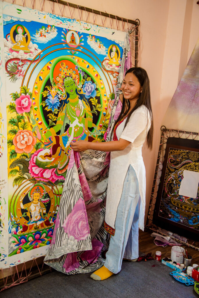 Und Minchu und Susma sprühen ja auch vor Plänen. In der Gemeinschaft der Tamang und in ihrer buddhistischen Umgebung fühlen sie sich als Frauen und Künstlerinnen gleichberechtigt, lassen sie mich erkennen. Beide haben den Traum, später einmal Ausstellungen zu organisieren, um den Erhalt der Tamang-Kultur zu unterstützen. „Jede Kultur, jede buddhistische Schule und jede Religion soll bewahrt werden“, betonen sie. „Wir wünschen uns, dass unsere Thangkas als Tamang-Kunst wahrgenommen werden. Denn wir sind ja Tamang, keine Tibeter. Einige Menschen sagen, Tamang wüssten nicht so viel über den Buddhismus, weil sie arm sind. Daher möchten wir unsere Tradition bekannter machen.“ Susma, die mehrere Jahre in einem Restaurant ausgeholfen hat, hegt insgeheim noch einen weiteren Traum, wie sie mir erzählt: Sie möchte irgendwann noch einmal Kunst studieren, um noch mehr für die traditionelle Kunst tun zu können.