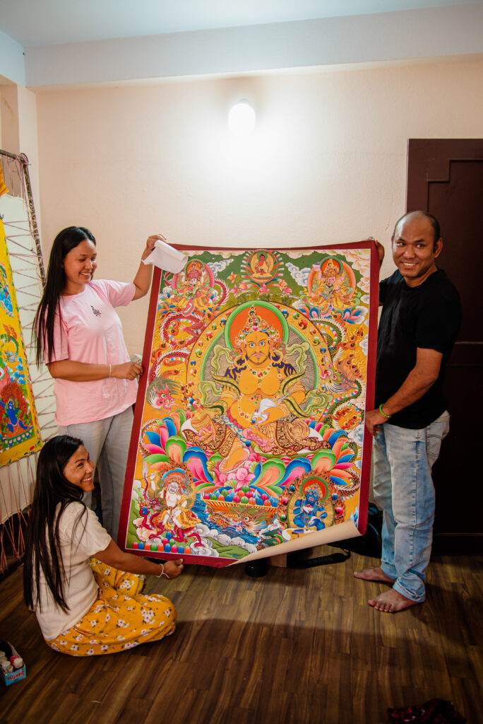 Kurze Zeit später saß ich mit Minchu und ihrer älteren Schwester Susma bei einem Nescafé in der kleinen Galerie der beiden. Ich sah mich um. Kein Zweifel: Minchu und Susma waren äußerst begabte Künstlerinnen. Die einfachen Umstände ihres Ateliers ließen die schöpferische Kraft ihrer Thangkas umso stärker strahlen. Gleichzeitig nahm mich die erfrischend ungekünstelte und herzliche Art der beiden Frauen ein. Wohlhabend schienen sie mir trotz der eigenen kleinen Galerie nicht zu sein. Ich gab zwei Thangkas in Auftrag.