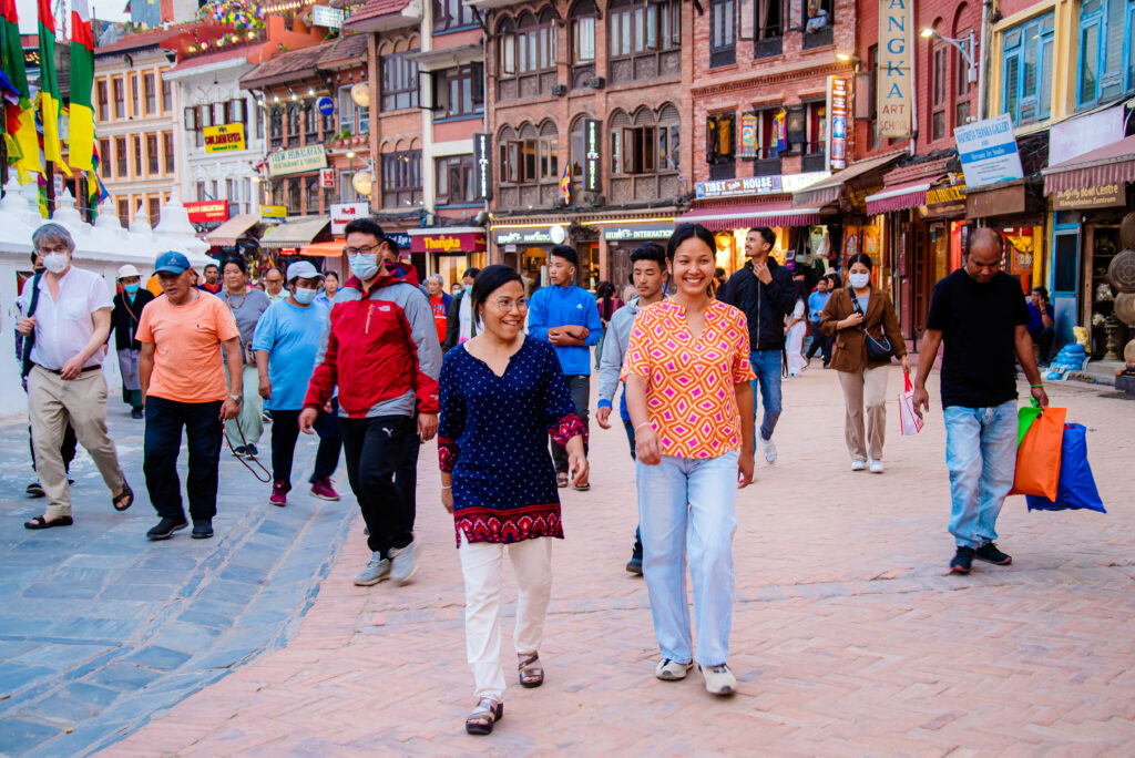 Nach der Morgenmeditation tauchte ich regelmäßig in den frühmorgendlichen Strom der kora-Gehenden ein; Kora nennt man die rituelle Umrundung eines Stupa oder anderen Heiligtums. Anschließend setzte ich mich zum traditionellen nepalesischen Milchtee auf die Stufen des Klosters Guru Lhakang zu den Einheimischen. Wie gut es mir hier ging. Die ungeschminkte Einfachheit dieses Ortes schenkte mir Entlastung und Erdung. Nur mein Thangka hatte ich noch nicht gefunden. Zwei sympathische junge Nepalesinnen setzten sich direkt neben mich auf die Stufen. Einer Eingebung folgend fragte ich sie, ob sie wüssten, wo ich mein Thangka wohl finden könne. Zu meiner Überraschung sagten sie: „Den können wir dir doch malen!“