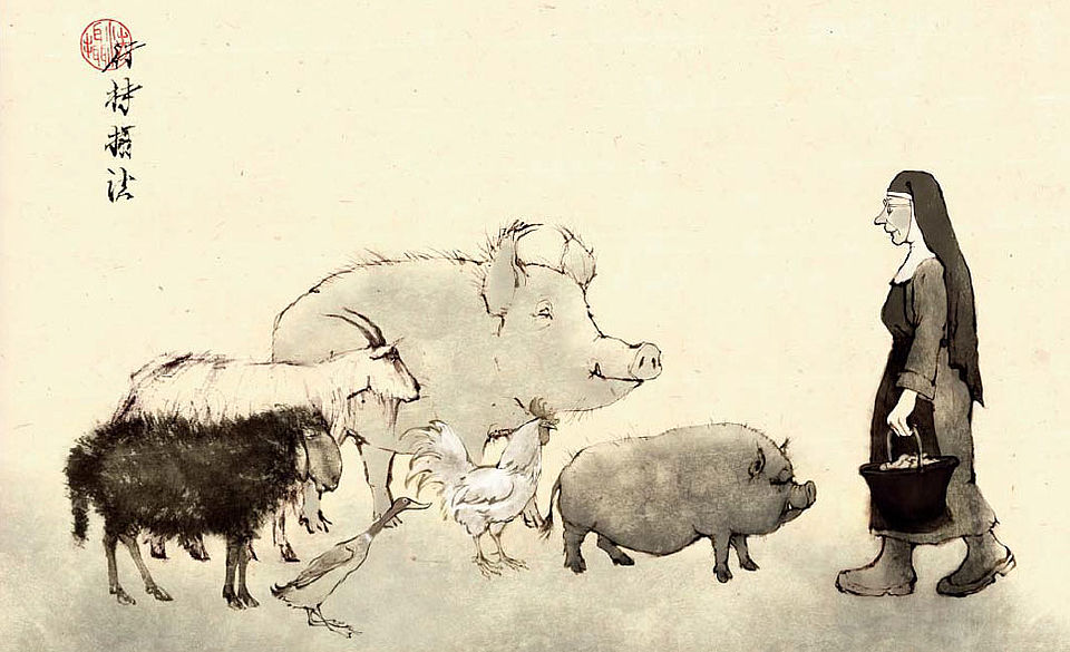 ST: Bei den meisten Fütterungen kann man sagen, dass Gier da ist. Und es gibt Aggressionen zwischen ihnen. Aber Tiere können darüber nicht reflektieren. Sie leben auf reine Weise ihrer Art entsprechend. Mir kommt es so vor, dass dieses Dunkle fehlt, das mit bewussten Entscheidungen zu tun hat. Tiere können mit so wenig froh sein. Zum Beispiel Anton, eins unserer Schweine. Er schiebt das Gras ein wenig weg, legt sich in ein Erdloch und lächelt in die Sonne. Er sieht dann so zufrieden aus wie der lachende Buddha. Man sieht, dass das für ihn Glück ist, einfach in Ruhe da sein zu können. Auch für uns Menschen gibt es unscheinbare, uns glücklich machende Dinge. Man muss sie nur nehmen und genießen, man braucht sie nicht zu kaufen. Wenn ich frühmorgens auf der Leiter von meiner Kammer herunterkomme und Nuria wedelt freundlich mit dem Schwanz, dann fühle ich mich so beschenkt. Im Zendo schließt sich der Kreis. Alle sind mit drinnen und sie wissen es irgendwie auch. Sie haben ein Wissen, das nicht vom Verstand geprägt ist. Wir kommen mit der Meditation auch an diesen Punkt, wo ein anderes Wissen da ist. Und je tiefer wir vordringen, umso mehr kommen wir in eine Einheit mit allem, wo Begegnung in einer ganz zentrierten Art da ist. Manchmal geht dieses Gefühl bei mir so weit, dass ich uns als einen Körper empfinde, z. B., wenn der Anton in seinem frisch gemachten Strohnest liegt. Dann spüre ich mit, dass es ihm gutgeht. Babuschka, ein blindes, taubes und gehbehindertes Schwein, liegt viel, und es tut ihm gut, wenn man es bürstet, damit der Kreislauf in Gang gebracht wird. Und dann entstehen Glücksmomente für beide Seiten. Dann ist die Welt in Ordnung. Abends ist hier die Hauptarbeitszeit mit den Tieren, weil sie alle hineingeführt werden müssen. Manchen kommt es komisch vor, dass ich als Zen-Priesterin oft bei der Abendmeditation fehle. Aber ich denke, ich bin sehr da und dabei. Die Begegnung mit den Tieren verringert die Gefahr, an den Formen hängen zu bleiben. Dahinter leuchtet auf, was man Urgrund nennt. Die Formen sind eigentlich dafür da, dies offensichtlicher zu machen, aber manchmal geht dabei der Schuss nach hinten los. Formen haben eine Wirkung ähnlich der Verhaltenstherapie: Sie verstärken das Gefühl, dass du etwas richtig machst, wenn du sie richtig ausübst. Und alle orientieren sich an demjenigen, der es „richtig“ vormacht. Dabei geht es doch eigentlich um etwas anderes und nicht um richtig oder falsch.