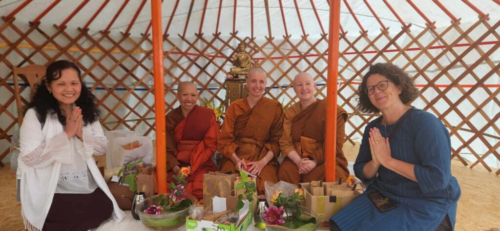 Für das interessierte Publikum moderierte die Äbtissin der Anenja Vihara, Ayya Phalanyani, die Veranstaltung, sodass jede und jeder die einzelnen Schritte gut nachvollziehen konnte. Da zahlreiche Besucherinnen und Besucher gekommen waren – darunter Familienmitglieder und Freund:innen der Ordinierten sowie langjährige Unterstützer:innen der Anenja Vihara und neue Interessierte – reichte der für die Ordination vorbereitete Saal bei Weitem nicht aus, um alle aufzunehmen. Die, die keinen Platz gefunden hatten, und auch die Zuschauer:innen zu Hause konnten den ersten Teil der Ordination per Videoschaltung verfolgen. Der zweite Teil der Zeremonie, die Ordination durch die Bhikkhus wurde nicht übertragen. Während dieses zweiten Teils warteten die Gäste in feierlicher Stimmung, den Vorgang schweigend und wohlwollend unterstützend, um die Jurte herum.
