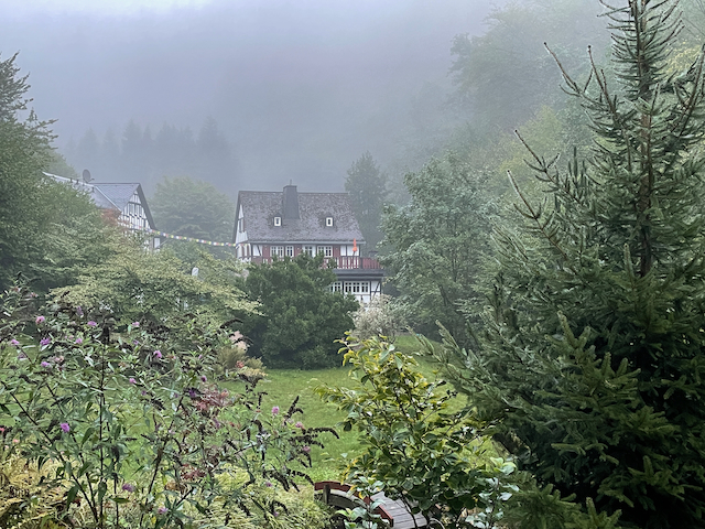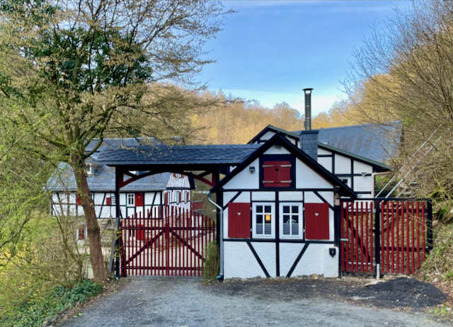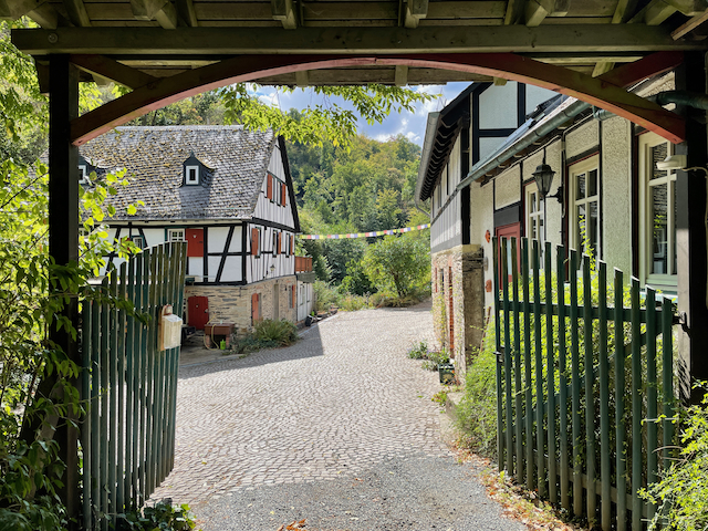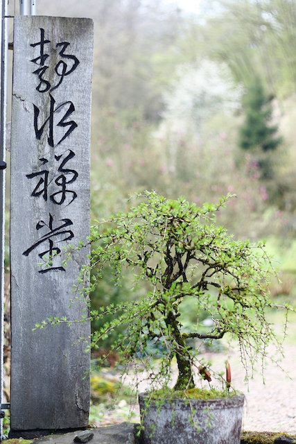 Ganz frisch und als in jeder Hinsicht zentral zu bezeichnen ist der Umzug des Dojo. Vom eher dunklen und sehr geschützt liegenden Raum zu ebener Erde geht’s seit April ab unter die Weite des Haupthaus-Daches. Lichte Fenster, viel Platz nach oben und zu allen Seiten – der Dojo ist einfach großartig geworden. Geübt wird jetzt in mehr räumlicher Weite, mitten in den Kronen der Bäume und klangvoll begleitet vom Murmeln des Hasenbaches. Der Name des Dojo, NyuShinDo, sanfter Herzgeist Tempel, erzählt die ganze Geschichte in einem Wort. Neben Freude an der Erfahrung und damit verbundener Tiefe in der Erkenntnis spielt Schönheit in der neuen-alten Altbäckersmühle für HoKai und Pia in der Tat eine große Rolle. So sind die ziemlich kleinen Zimmer des 2022 frisch renovierten Gästehauses natürlich nicht größer geworden, aber durch die zenmäßig- schlichte Ausstattung wirken sie irgendwie großzügiger und über das rein Zweckmäßige hinaus schöner. Gleiches gilt für die frisch gestrichenen Türen, Fenster und Terrassenhölzer, für die bequemen und schönen Sitzgelegenheiten, die überall auf dem Mühlengelände verteilt sind. Der gesamte Ort mit Gästehaus, Haupthaus und Gartenanlage ist von ruhiger Klarheit, von kleinen Schönheitsimpulsen geprägt – das macht nicht nur Freude, sondern mag unruhigen Geister durchaus helfen, stiller zu werden.