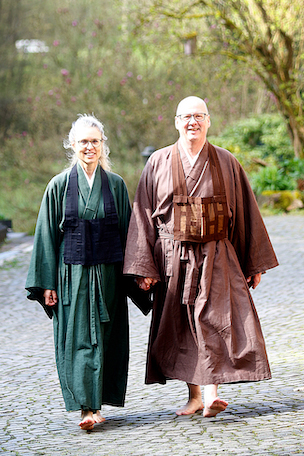Kann mensch mitten in Europa ein spirituelles Amt erben? Vom eigenen Vater respektive den eigenen Eltern? Mensch kann. Und ja, leicht ist das nicht unbedingt, schließlich betreten alle Beteiligten einzeln und gemeinsam Neuland –  Vorbilder Fehlanzeige, Anfängergeist unumgänglich, weil es, anders als in Japan, hierzulande ganz und gar nicht üblich ist, der Dharma-Nachfolger der leiblichen Eltern zu werden. In der Altbäckersmühle, einem von KyuSei und Genki Österle vor mehr als 30 Jahren mutig gegründeten Zen-Zentrum im Taunus ist genau das vor drei Jahren geschehen – die beiden gaben das räumliche und spirituelle Erbe an ihren Sohn HoKai weiter. Dieser Vorgang, Abt einer „geerbten“ Sangha zu werden, brachte und bringt nicht nur spirituelle Herausforderungen mit sich. So verließen KyuSei und Genki zwar die nicht besonders alterstaugliche Altbäckersmühle als Wohnstatt, beendeten aber ihre Tätigkeit als praktizierende Zen-Meister und -Meisterin nicht. Warum auch? Beide leiten bis heute Sesshins, Bogentage und Yogakurse, begleiten ihre Schüler:innen, sind spirituell präsent, aber nicht mehr führend verantwortlich.