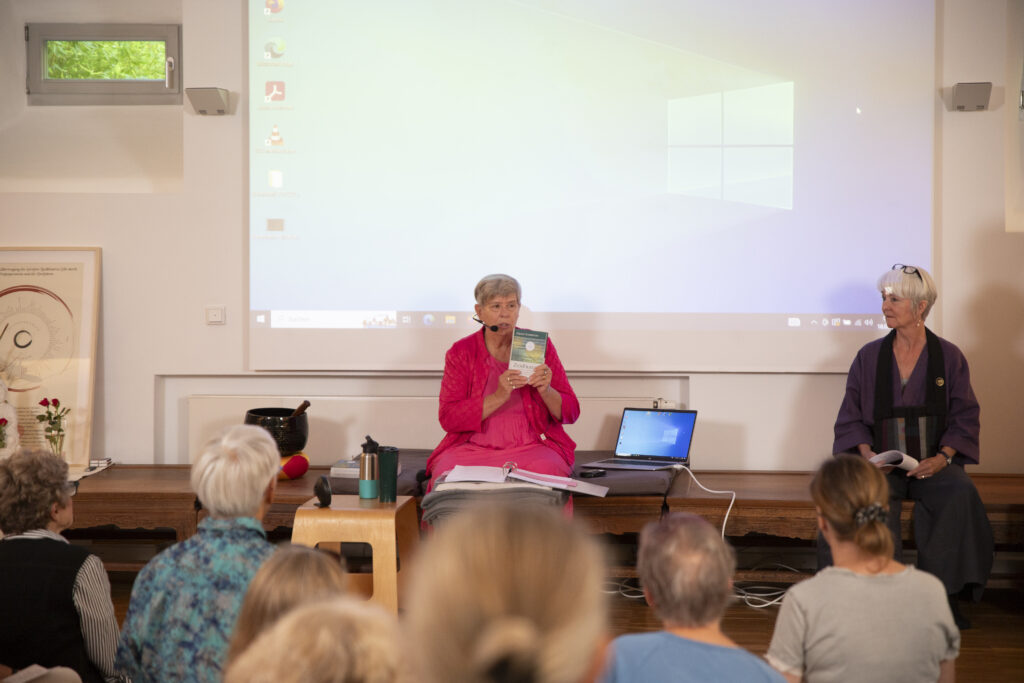 Die Vorträge waren teilweise sehr persönlich gehalten und berührten die Zuhörenden, da sie die Härten und besonderen Herausforderungen, aber auch die Stolpersteine thematisierten, denen Frauen ausgesetzt sind, wenn sie konsequent den Zen-Weg gehen. Des Weiteren ging es darum, die Spuren unserer Ahninnen freizulegen und zu schauen, inwieweit wir ihr Vermächtnis für die eigene Praxis fruchtbar machen können. Wir loteten auch gemeinsam aus, wie eine Zen-Praxis aussehen könnte, die stärker die Dimension des Mitgefühls einbezieht. Eine Praxis, die nicht mehr einfach die bisherigen einseitig männlichen Narrative über Zen (streng, hart, unerbittlich, gewaltvoll, schweigend, ichüberwindend etc.) zum Maßstab aller Dinge macht, sondern sie kritisch hinterfragt und mindestens durch weibliche Perspektiven ergänzt. Zu diesen männlichen Narrativen gehört auch die Annahme einer rein männlichen Zen-Übertragungslinie, die bis zum Buddha selbst zurückgeführt wird. Längst ist wissenschaftlich erwiesen, dass eine Übertragungslinie in dieser Form eine Fiktion ist. Aber sie wird in vielen Zen-Klöstern und -Zentren bis heute rezitiert, und das hat natürlich eine Wirkung auf Frauen. Dank der Forschungen und des Engagements von Zen-Frauen in den USA gibt es mittlerweile eine Soto-Zen-Ahninnen-Reihe, die inzwischen ebenfalls vielfach rezitiert wird. Linda Myoki Lehrhaupt stellte sie vor und wir rezitierten sie und verbanden uns auf diese Weise mit dem reichen Erbe unserer Vorfahrinnen.