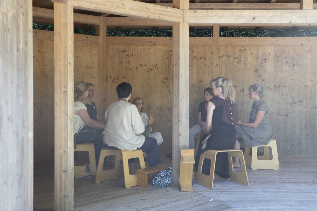 Zu neueren Ansätzen der Zen-Praxis gehört seit einigen Jahren die gemeinschaftliche Arbeit an Koans. Vorgestellt wurde dieser Ansatz erstmals von Florence Caplow und Susan Moon in dem Buch „Das verborgene Licht, 100 Geschichten erwachter Frauen aus 2500 Jahren, betrachtet von (Zen-)Frauen heute“. Susanne Dittrich, die seit Jahren mit Gruppen auf diese Weise arbeitet, stellte diese Form der Praxis vor und wir probierten sie in Kleingruppen aus. Am letzten Abend waren die beiden Herausgeberinnen des Buches per Zoom zugeschaltet und sprachen über die vielen Möglichkeiten kreativer Auseinandersetzung mit Koans und wie das auch weitere Innovationen in der Zen-Praxis inspiriert. Die Tagung ließ viel Raum für Gespräche der Teilnehmerinnen untereinander. Deutlich wurde das große Interesse, diese Themen weiter zu vertiefen, sich mehr zu vernetzen, traditionelle Hierarchien im Zen kritisch zu beleuchten und aufzubrechen, Formen zu finden, die uns mehr auf Augenhöhe miteinander bringen, die uns helfen, Zen zu praktizieren, ohne uns als Frauen dabei verbiegen zu müssen. Aufgrund des großen Interesses ist eine weitere Tagung im Benediktushof angedacht mit dem Titel „Strahlendes Licht – was Zen-Frauen in die Welt tragen“. Stattfinden soll sie vom 28. bis 31. August 2025.